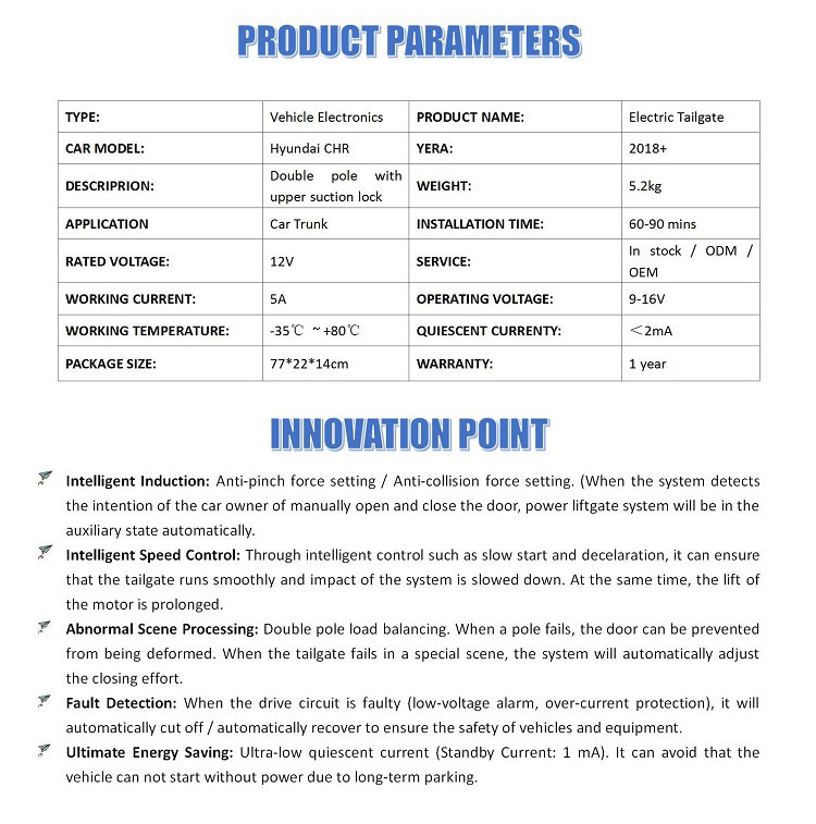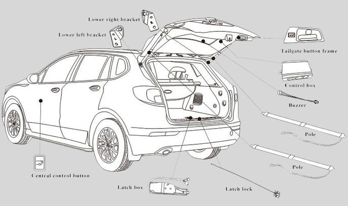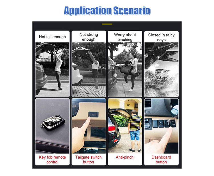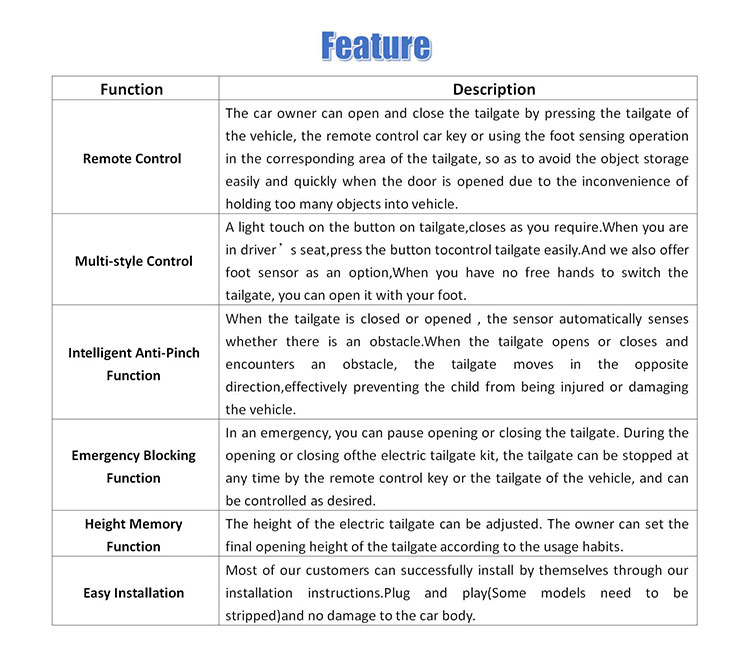 1. Multiple control methods: Key fob, dashboard button and tailgate switch button 2. Intelligent Speed Control: 3. Anti-pinch 4. Setting height memory 5. Kick sensor (optional)