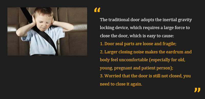 When the door is closed to the semi-locked state (The door has a 6-9 mm gap), the door lock tongue will touches the lock and the tensioning auxiliary device will gently close the door automatically. The motor drive of the door lock system automatically tightens the door lock from the semi-lock position to the full lock position. When the door is closed, the door closing noise will not be issued, which greatly improves the safety and comfort of closing the door.